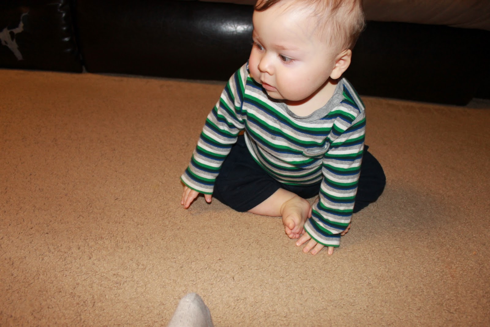 I figured that I better add Caiden's eight month stats before he turns nine months old in just a couple days! Time really seems to have flown by, when it comes to this little guy. He turned eight months old on December 10, 2011. He continues to be my happy little (maybe not so little anymore) man! Except with a little edge to him. His personality really has started emerging and for the most part he is just easy going and laid back, but he does let you know when he's unhappy with you. Usually by grunting his displeasure. He's grunted since he was a couple of days old. It's pretty funny actually, if he is trying to do something and you somehow thwart or impede his progress, he grunts and kind of growls at you. When he's playing with something that Ayla takes away he gets mad and grunts at her. Maybe grunt isn't the right word I guess it's more like a guttural growl. It's pretty funny. He loves his Mommy and his Daddy pretty equally. This makes Daddy happy because Ayla always preferred me,Caiden is happy with either of us. He'll be perfectly happy with me, and then when Daddy gets home he gets really excited and starts reaching for him and laughing. Daddy loves it. I don't have any official stats, because he didn't have a doctor's appointment this month, but my guess is that he's somewhere between 19-20 lbs. He fits in 6-9 month clothes but they're pretty snug, 12 month clothes are much more comfortable on him. Unfortunately for him he has the short little legs that both of his parents have and most pants are too long on him. I just started putting him in size 4 diapers, size threes were way too tight. He is so close to crawling, but too be honest he gets around fine with a combination of rolling, turning himself in the right direction with his arms and then doing a kind of military crawl using his arms and a little pushing with his toes.It's really cute. Both of my kids have been late bloomers when it comes to crawling. Ayla didn't crawl until she was nine months old and then walked at ten months old. Looks like Caiden is going to follow suit. He LOVES tooling around in his walker. I try not to put him in it too much because now there's this research that says that it causes kids to walk later. I don't know, Ayla walked early. But anyway, it is a good place for me to put him when I'm busy and don't want to leave him in the living room at the mercy of Ayla. He does really well in the walker actually almost running in it. He always heads right for the fridge and plays with the magnets. He also loves his jumper. He LOVES jumping and won't just stand. If you hold his hand he will pull up to a standing position and stand there bouncing. He sometimes won't sit now, but tries really hard to stand. I sometimes lean him up against the couch and put some toys on the couch for him. I stay right behind him, but he'll stand there for awhile just playing with the toys. He still has yet to get his first tooth. Apparently my kids are late bloomers in that area too, Ayla didn't get her first tooth until she was 13 months old. I keep thinking that his first tooth is on the way because he's been drooling for months, but I guess he's just drooley. He says, Dada and Mama but we're unsure if he knows what he's saying. He claps his hands and gives kisses. (Which are more like a big drooley lick, but still cute!) He loves eating and I have yet to feed him anything that he won't eat. He doesn't really like green beans or peas but he'll eat them. He LOVES avocados and I often grind them up in my bullet and make a few meals for him out of a couple avocados. He loves cheerios and if I put some on his tray he will amuse himself for quite awhile pushing them around and actually getting some in his mouth. He LOVES the little tool bench that he got for Christmas. I showed him how to bang with the hammer and he has become an expert banger. He now bangs on anything and everything with that hammer, or anything that even slightly resembles his hammer. He also really likes Ayla's toys of course. It's funny how that happens. It seems sometimes like he plays with her toys more and she plays with his more. I guess the grass is always greener on the other side!